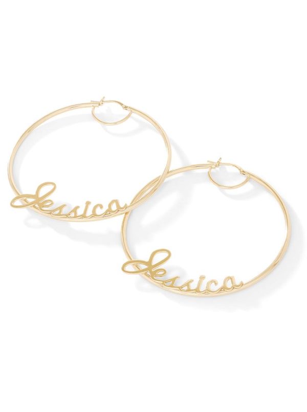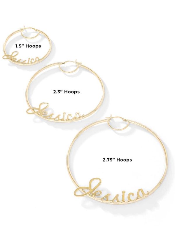 PRODUCT DESCRIPTIONPersonalized Hoop Earrings in 18K Gold Plated Sterling SilverThere are three sizes to choose from:40mm/1.5 Inches $7060mm/2.3 Inches $8870mm/2.75 Inches $99Model is wearing the 70mm/2.75 Inch Hoops. Enter up to 15 characters with no spaces. All personalized hoops sales are final. Please double check spelling!Personalized hoops are made to order and may take up to 17 days to ship. Once your hoops ship, you’ll be notified with ETA.