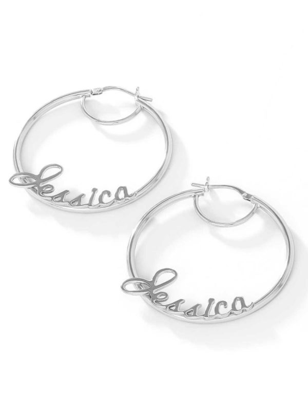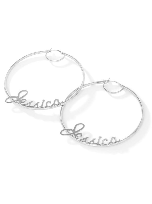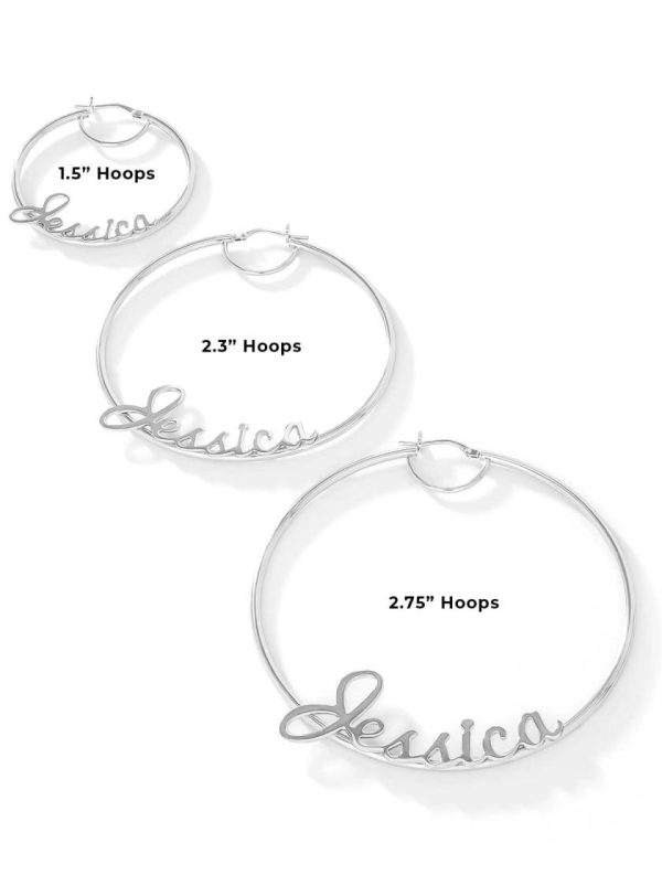 PRODUCT DESCRIPTIONPersonalized Hoop Earrings in Sterling Silver. There are three sizes to choose from: 40mm/1.5 Inches $7060mm/2.3 Inches $88 70mm/2.75 Inches $99Model is wearing the 70mm/2.75 Inch Hoops. Enter up to 15 characters with no spaces. All personalized hoops sales are final. Please double check spelling!Personalized hoops are made to order and may take up to 17 days to ship. Once your hoops ship, you’ll be notified with ETA.