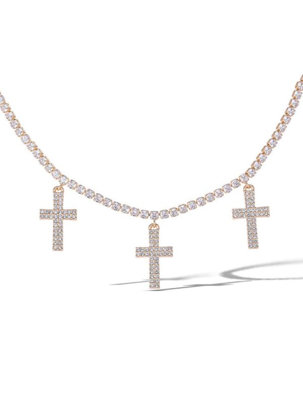 Three pave-studded crosses dangle from this necklace, symbolizing faith with a stylish, layered look.