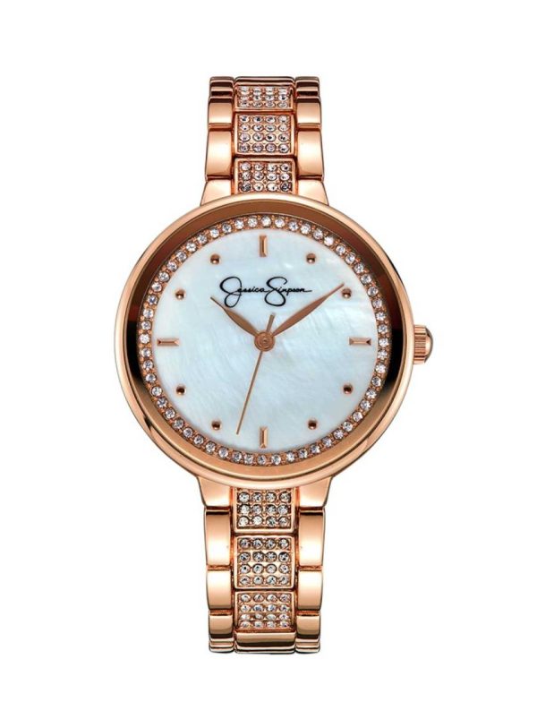Elevate your style with this stunning rose gold tone watch featuring exquisite crystal accents and a genuine mother of pearl dial that catches the light beautifully