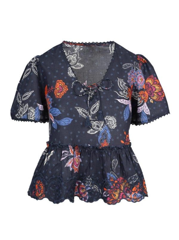 Elevate your wardrobe with this stunning peplum blouse featuring a vibrant Colorful Rio pattern in the captivating Polar Night colorway