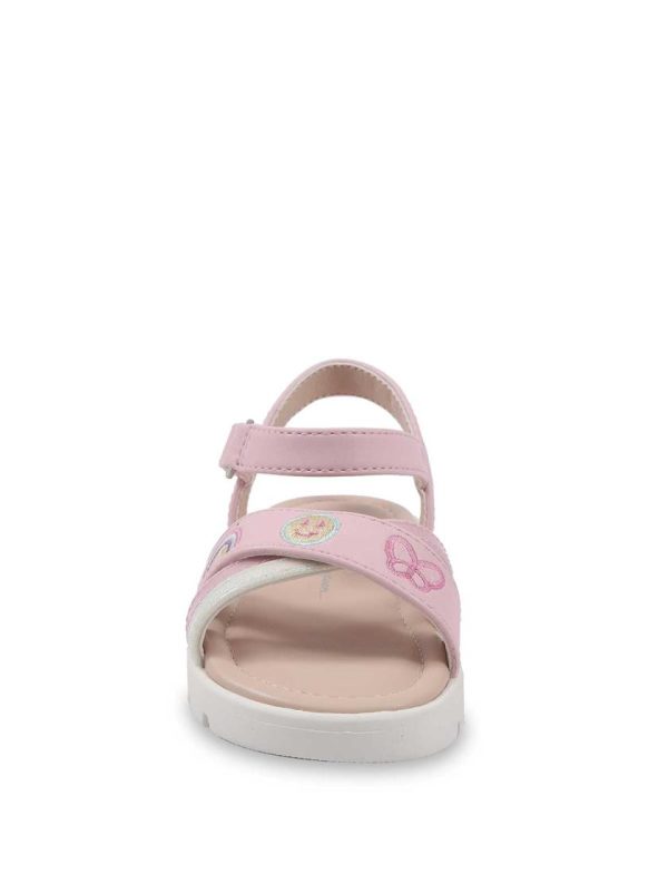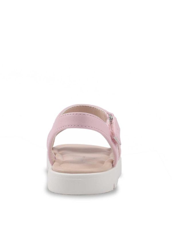 This girl’s sandal is a cute and sporty design in soft pink with rainbow and glittery details on the front straps. It features a hook-and-loop ankle strap for an adjustable fit and a cushioned insole for comfort. The white rubber sole has a slightly rugged tread for better grip, making it a fun and practical choice for everyday wear.
